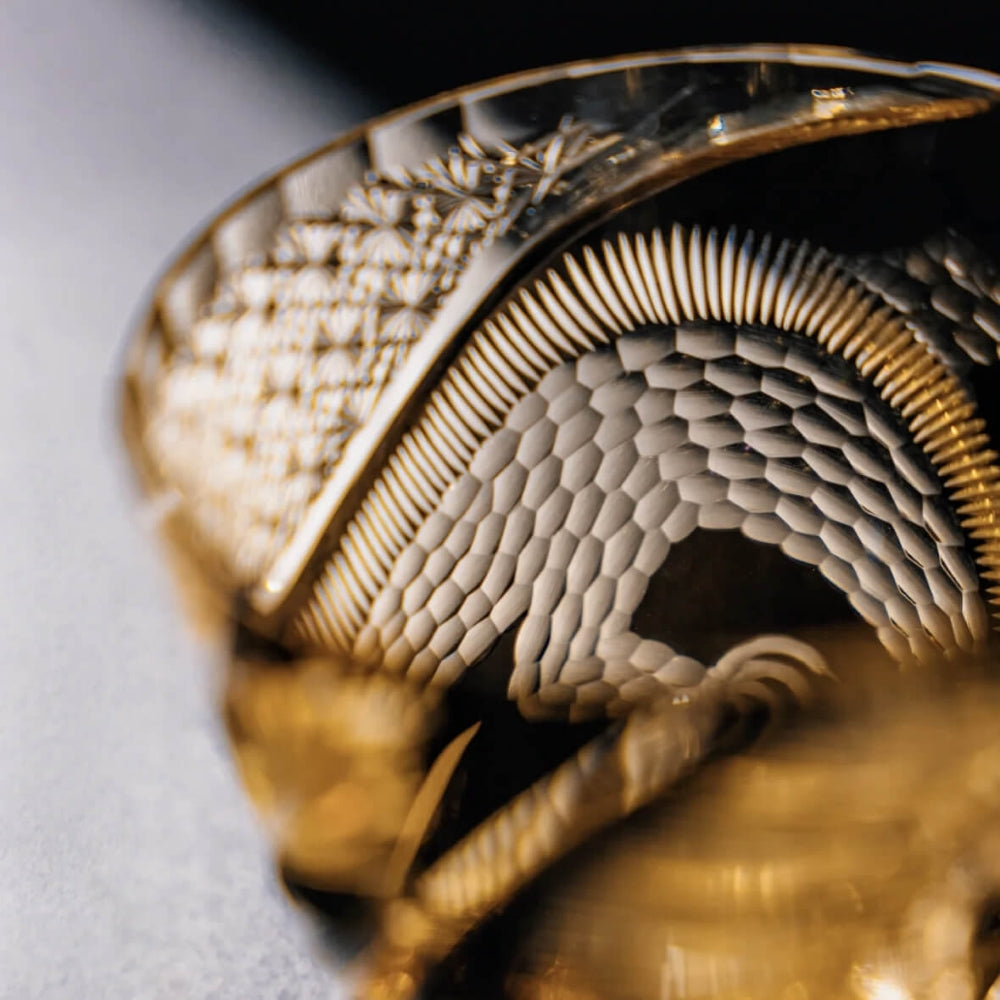 Handcrafted with meticulous precision, this Edo Kiriko whisky glass captures the essence of power and grace through its intricate dragon motif. The dark, polished surface contrasts with translucent engraved patterns, allowing light to flow through like fire beneath the scales — a striking symbol of vitality and strength. Each glass is individually hand-cut, showcasing the depth and brilliance unique to traditional Edo Kiriko craftsmanship.