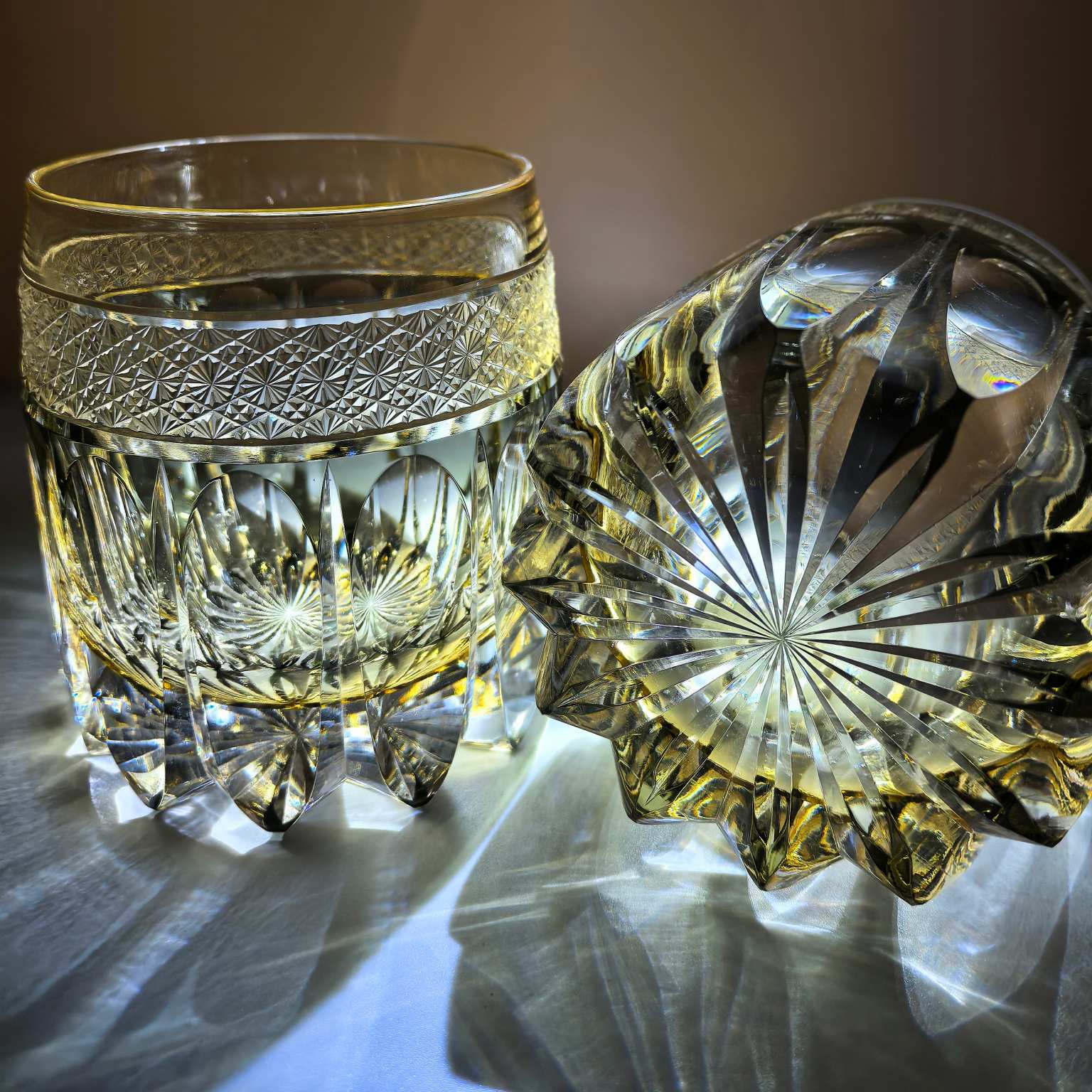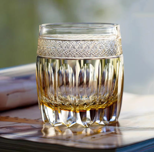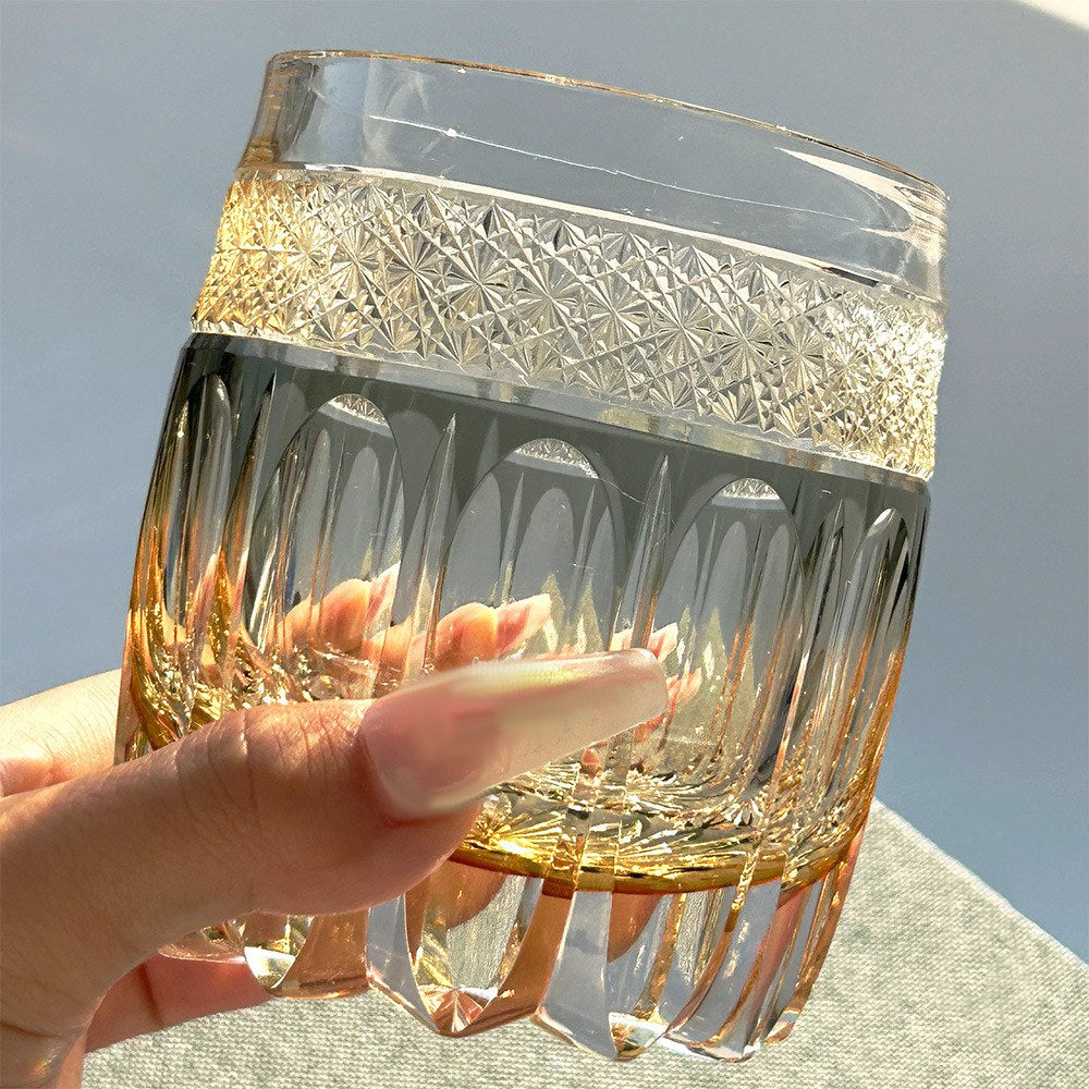 Hand-cut in the Edo Kiriko tradition, this grey-amber whisky glass features a distinctive drum-shaped silhouette paired with precise faceted cuts. The subtle amber tone softens the geometric reflections, creating refined light play across the curved body. Crafted from high-transparency crystal and finished through meticulous cold-cutting and polishing, it delivers both visual depth and a balanced hand feel.
