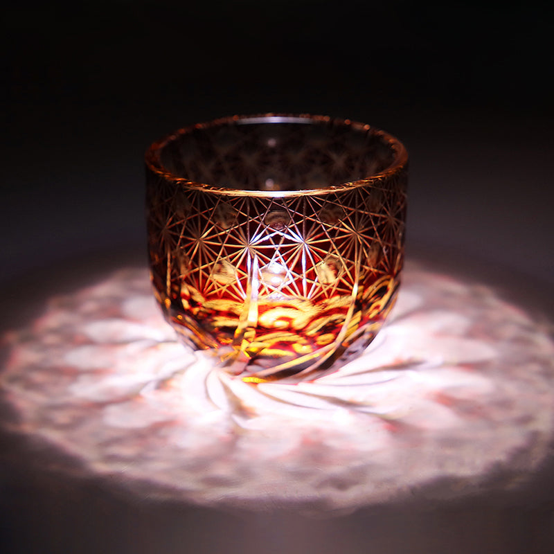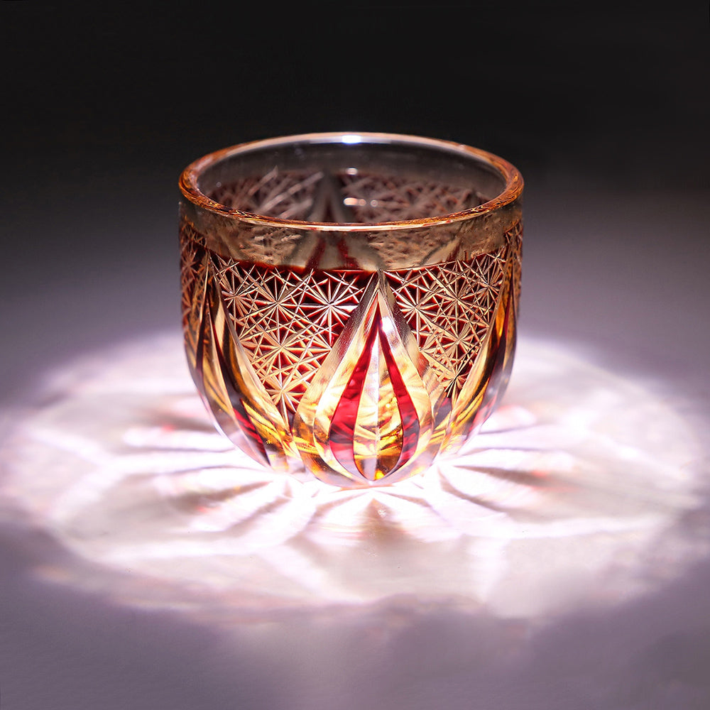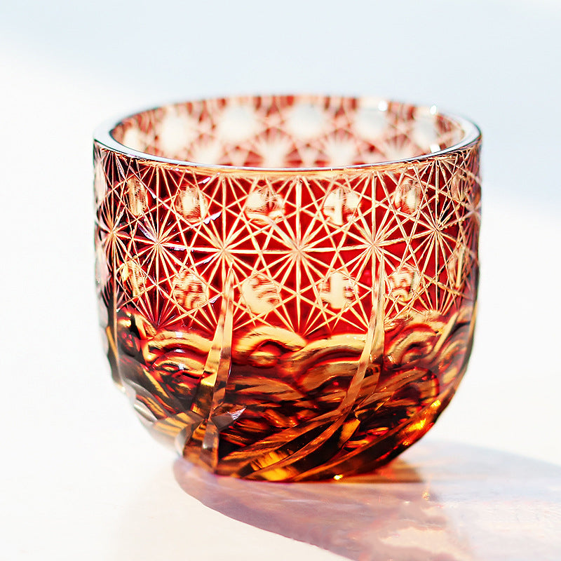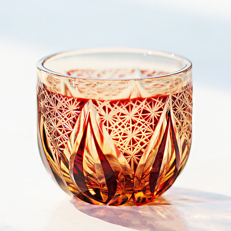 Hand-cut in the Edo Kiriko tradition, this crystal sake glass combines red and amber tones with unique facet patterns across its surface. Crafted from high-transparency crystal with precise cutting and polishing, it is suitable for display, collection, gifting, or enjoying in refined drinking settings. Packaged in a protective gift box for preservation and presentation.