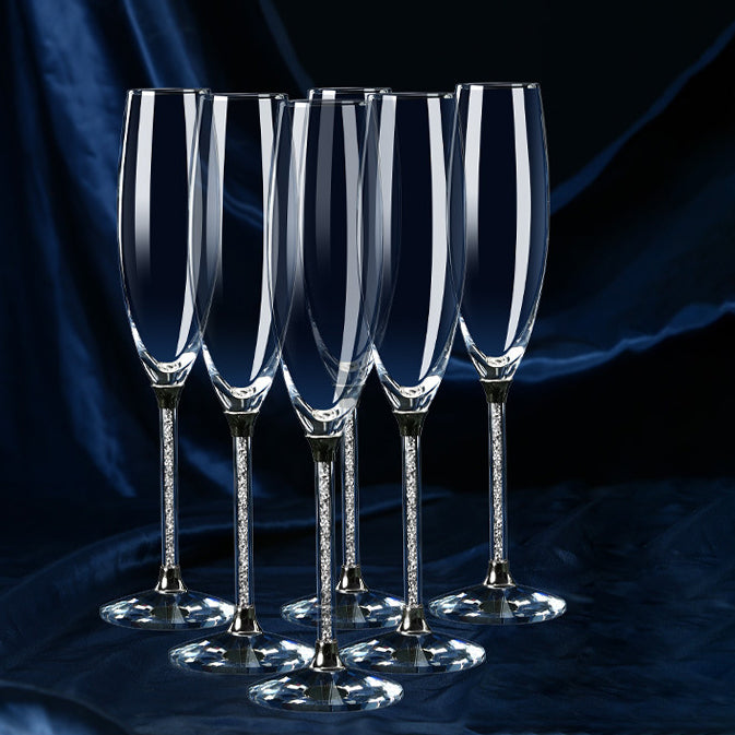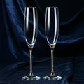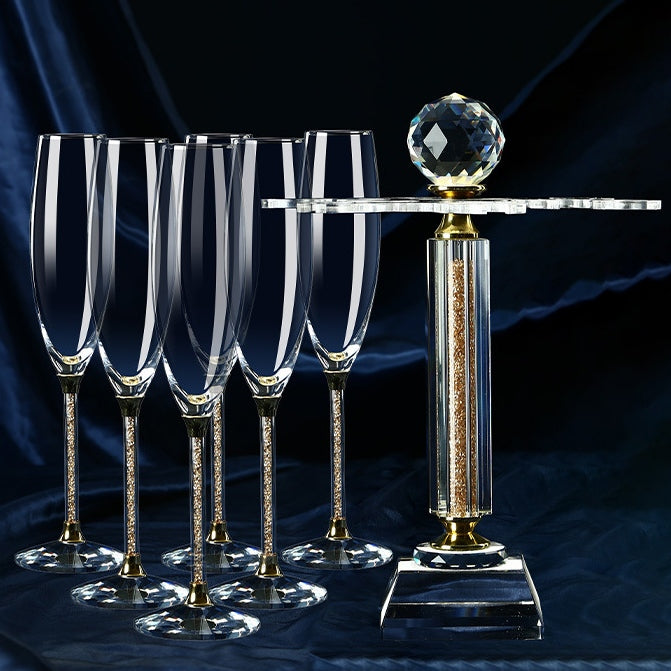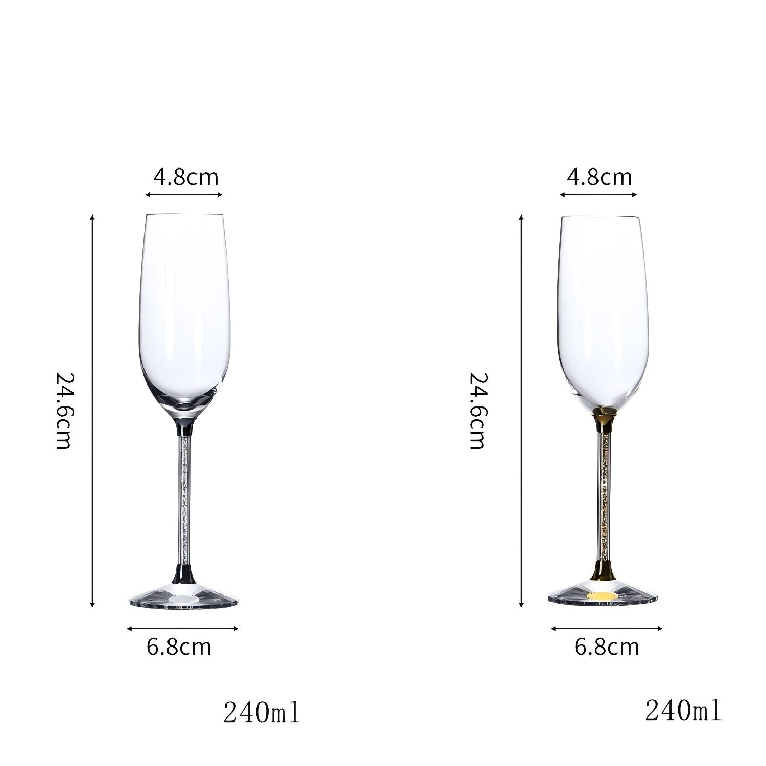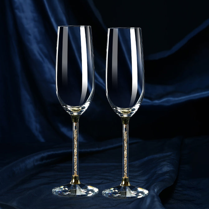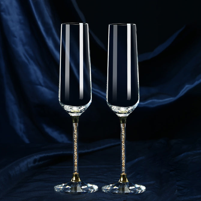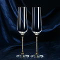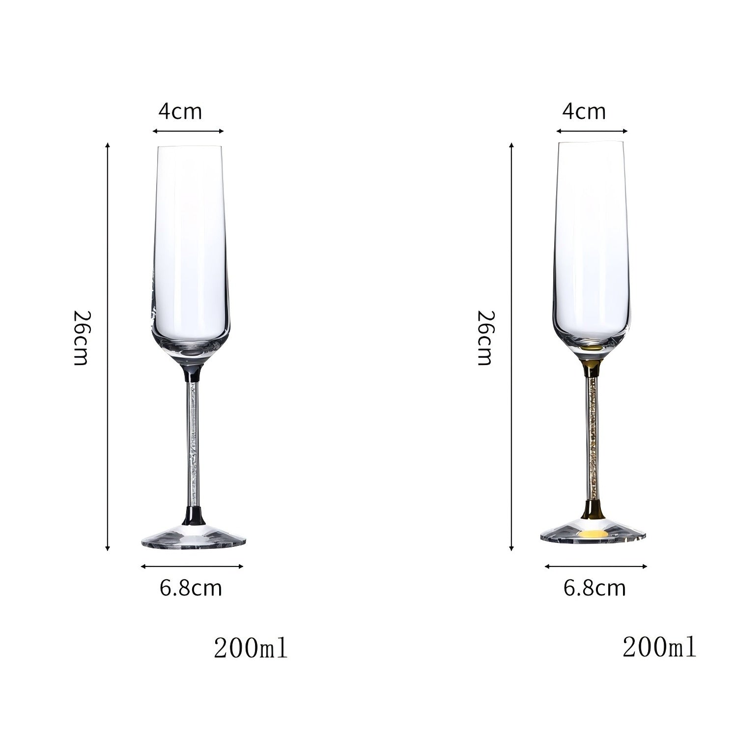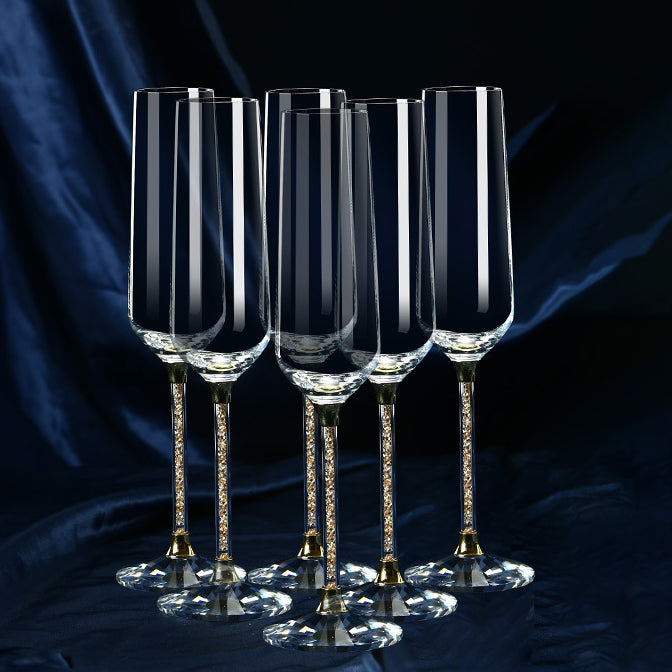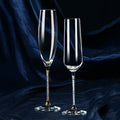Crafted from high-clarity lead-free crystal glass, this champagne flute features a tall, refined silhouette that enhances its modern, luxurious presence. The stem is filled with shimmering gold crystal fragments, creating a striking visual effect that catches and reflects light from every angle. Each glass undergoes a meticulous forming and polishing process to achieve clarity, uniformity and a flawless finish. Its clean lines, smooth surface and balanced proportions give the piece a contemporary elegance suitable for both display and use.