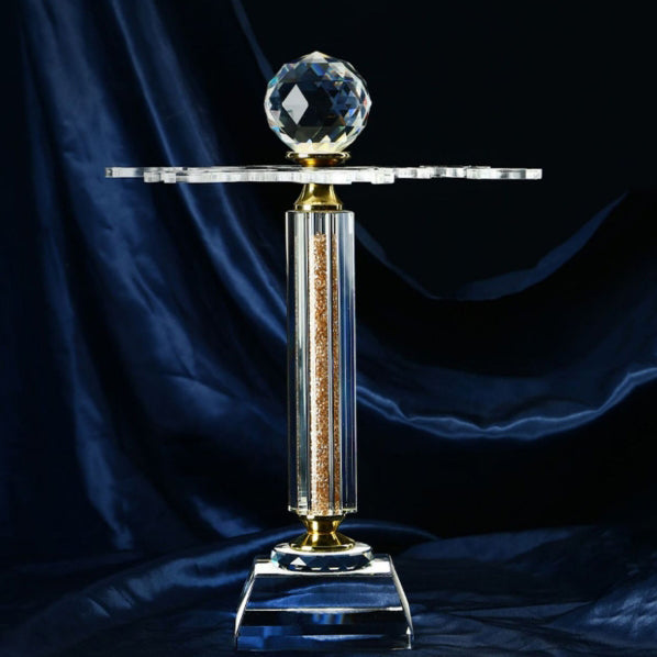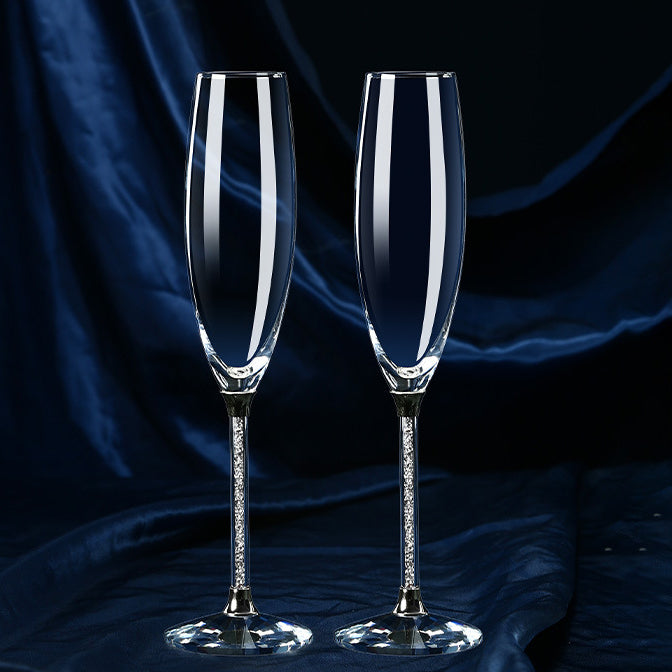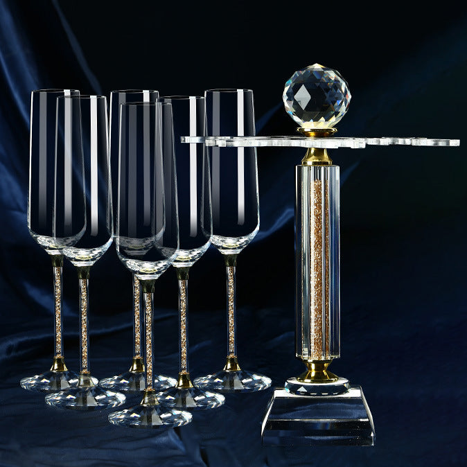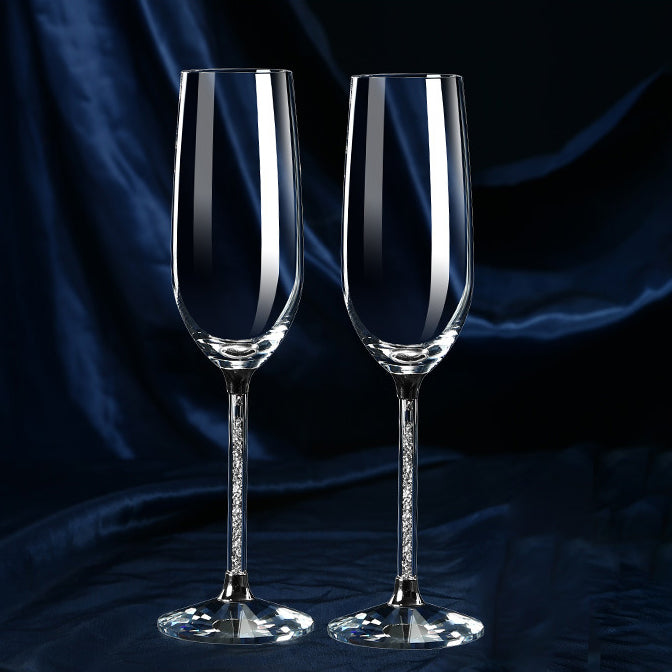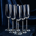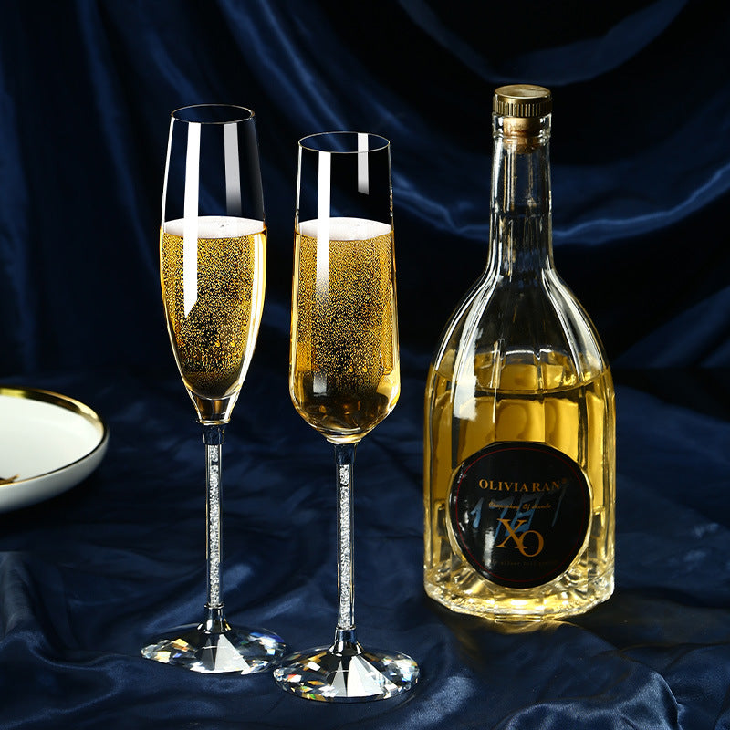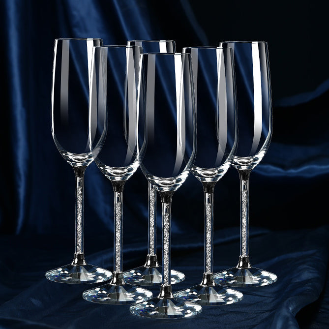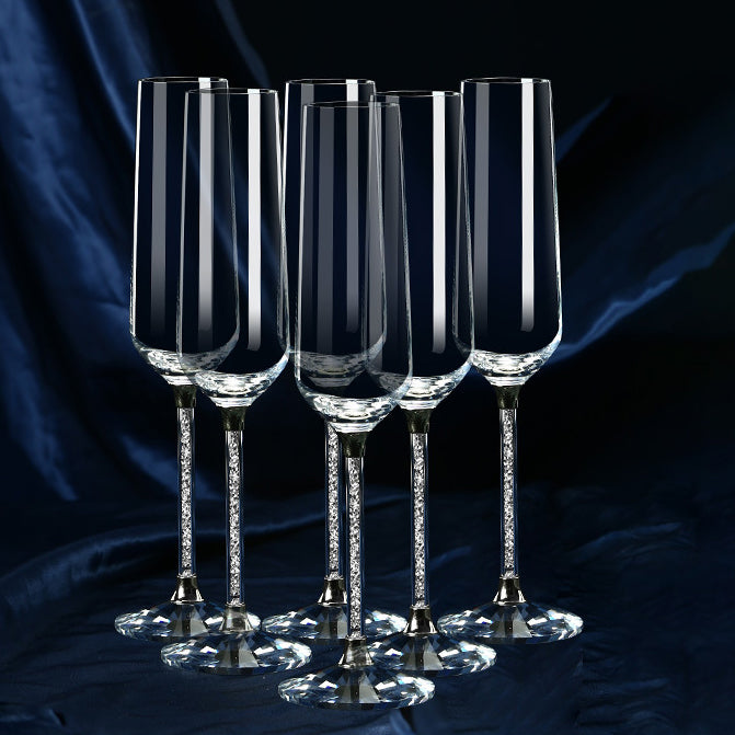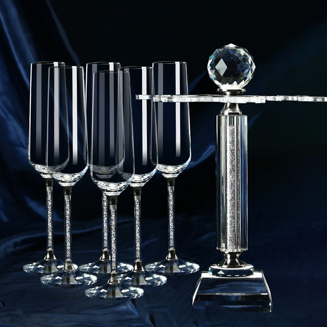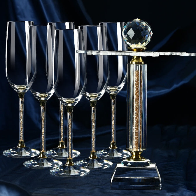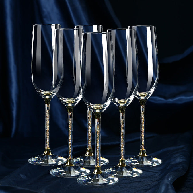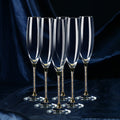 Crafted from high-clarity lead-free crystal glass, this champagne flute features a tall, refined silhouette that enhances its modern, luxurious presence. The stem is filled with shimmering gold crystal fragments, creating a striking visual effect that catches and reflects light from every angle. Each glass undergoes a meticulous forming and polishing process to achieve clarity, uniformity and a flawless finish. Its clean lines, smooth surface and balanced proportions give the piece a contemporary elegance suitable for both display and use.