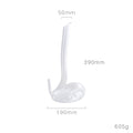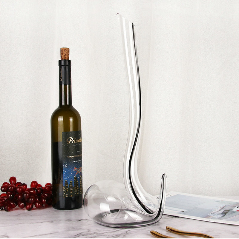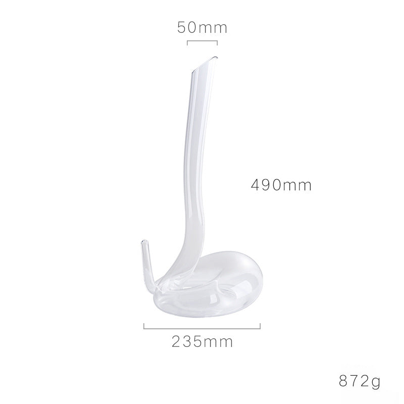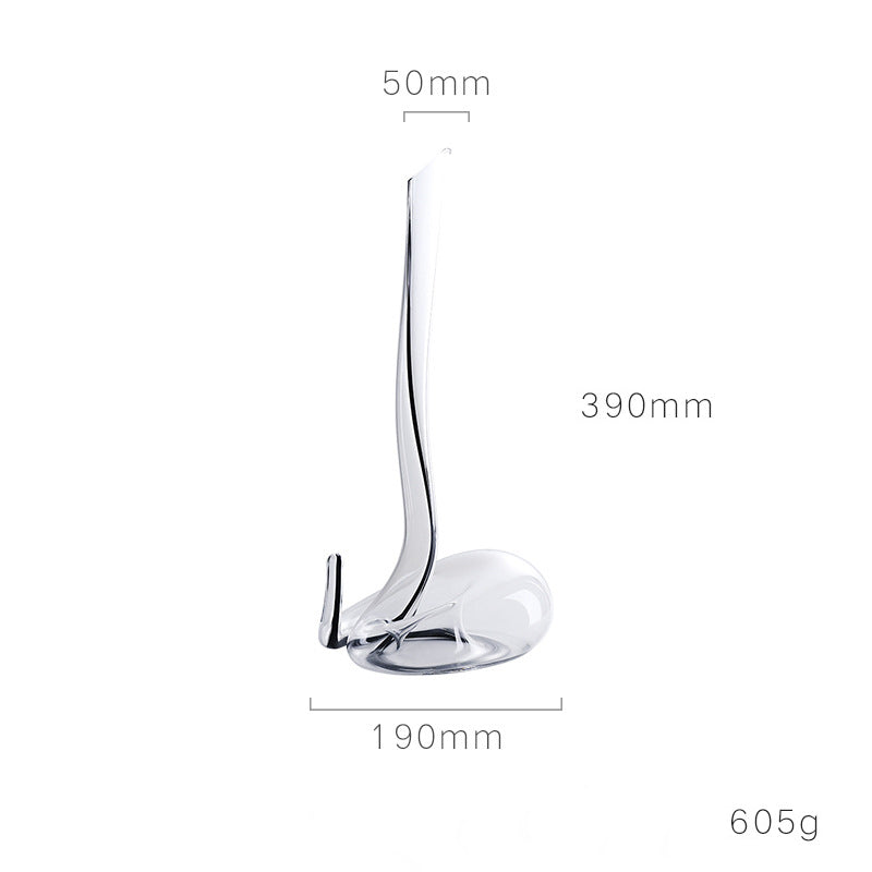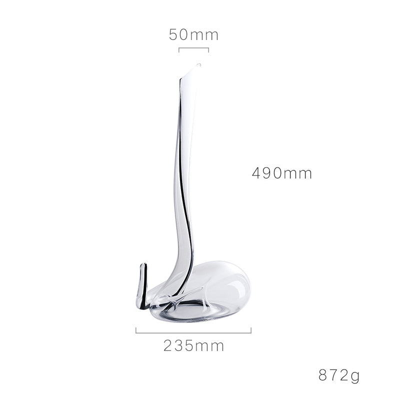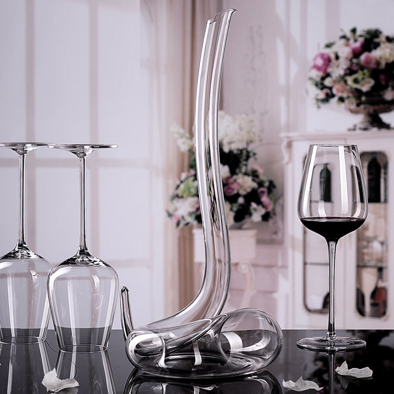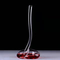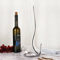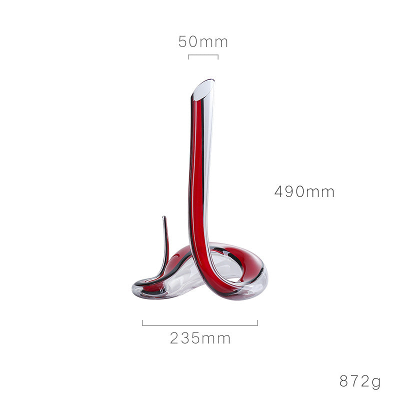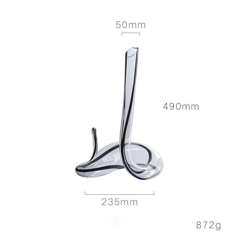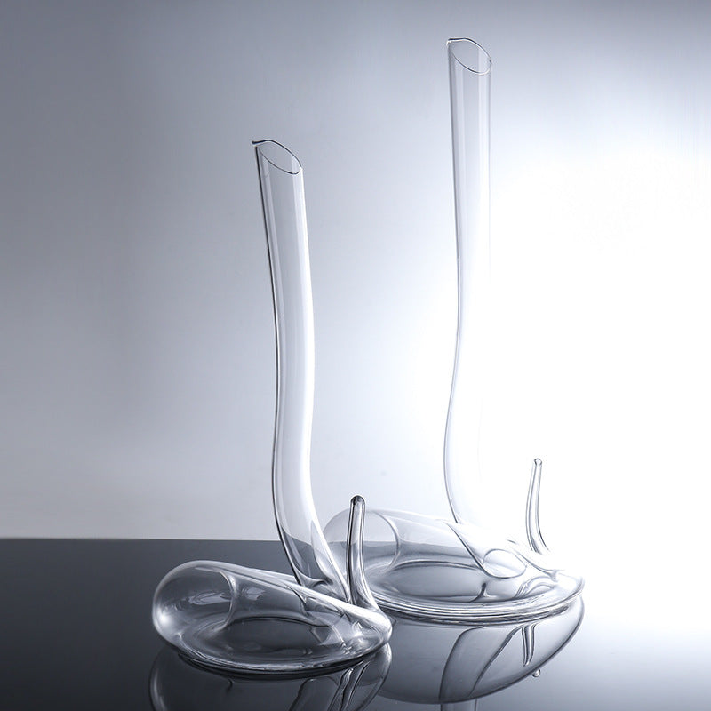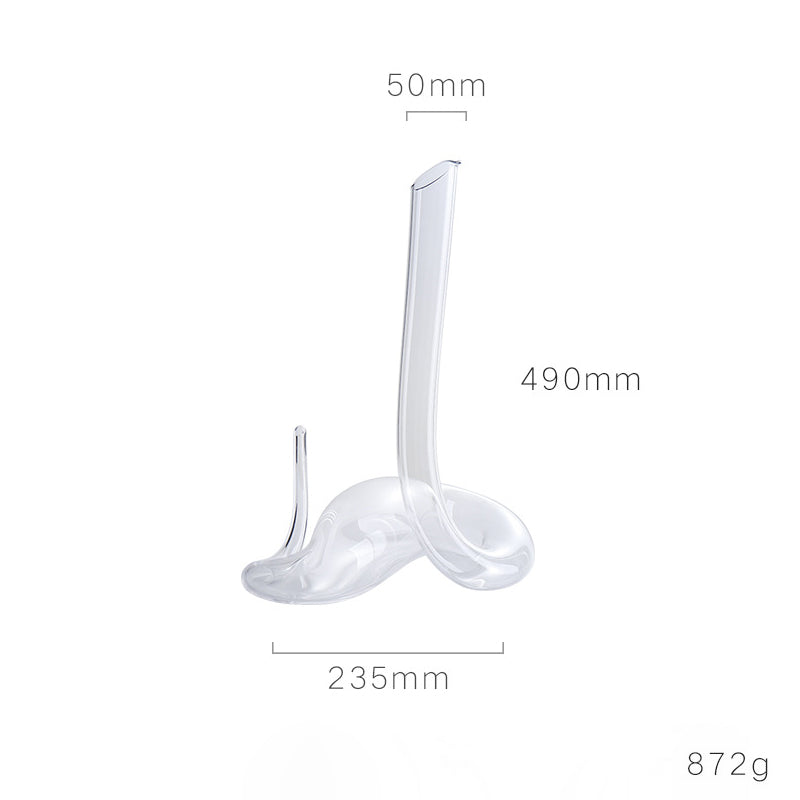 The flowing, serpentine silhouette is designed for both aesthetics and function—its curved body allows wine to cascade naturally, increasing aeration as it meets the inner surface. The elongated neck helps gather and concentrate aromas, while the balanced form provides a comfortable grip during pouring.